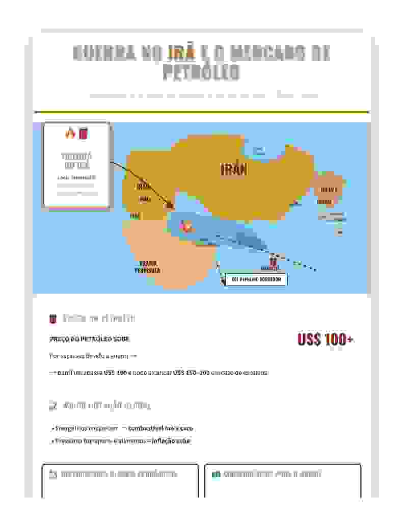 O impacto mais imediato da crise foi a disparada no preço do petróleo. Com ameaças diretas ao fluxo no Estreito de Ormuz por onde transita cerca de um quinto da produção mundial o mercado reagiu com forte volatilidade. O barril ultrapassou rapidamente a casa dos US$ 100, com projeções ainda mais pessimistas caso o conflito se prolongue.