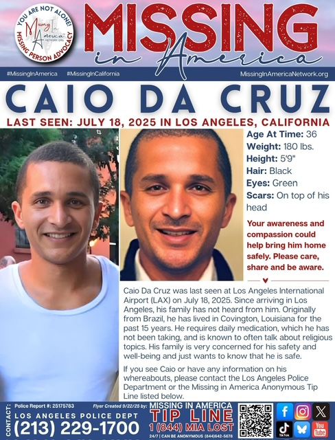 A família de Caio, que vive nos Estados Unidos há mais de 15 anos, está em busca de informações sobre seu paradeiro após quase dois meses sem contato. Caio está desaparecido desde 18 de julho, quando foi visto pela última vez a bordo do voo 2085 da Delta Airlines, que partiu de New Orleans (Louisiana) com destino a Los Angeles (Califórnia).